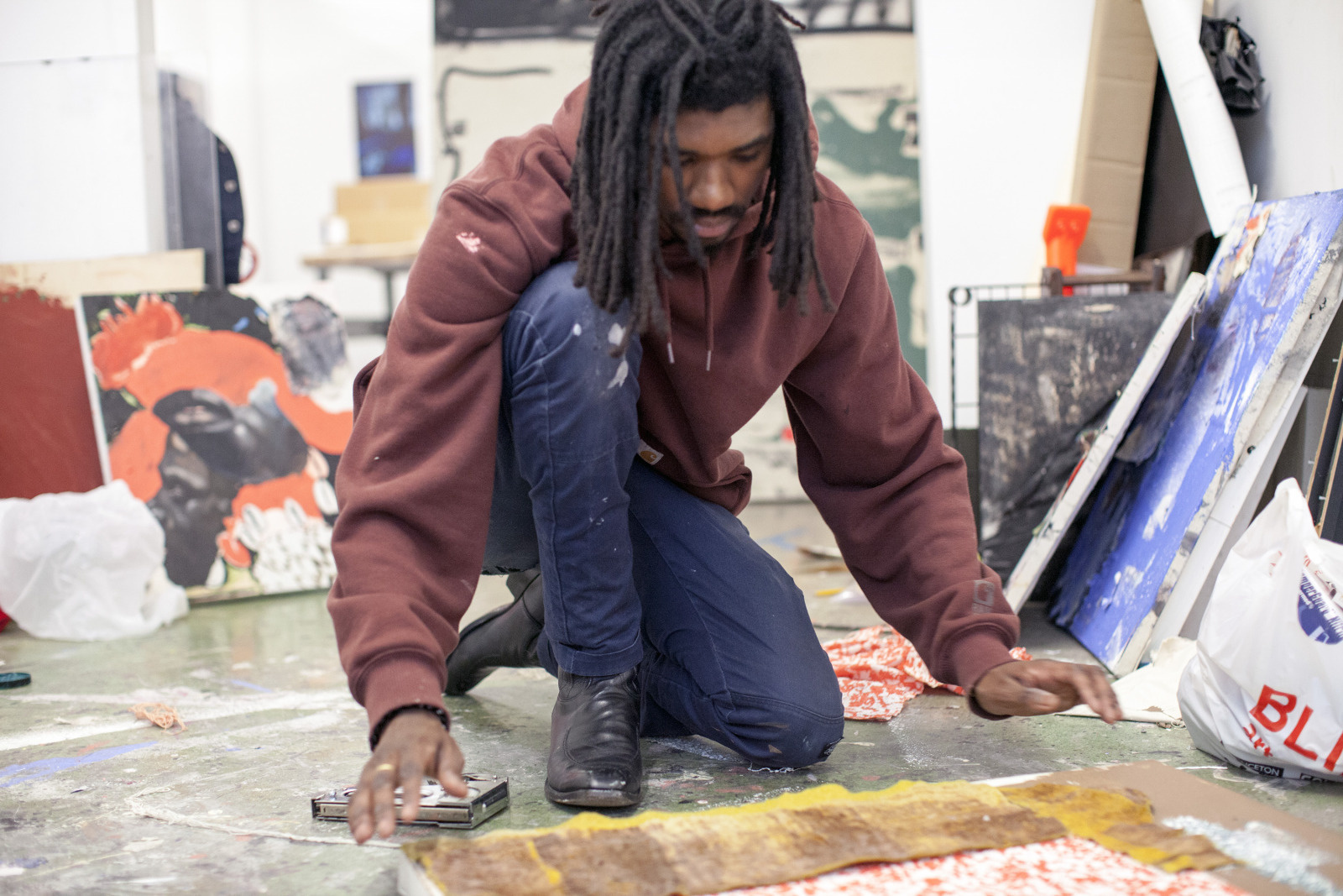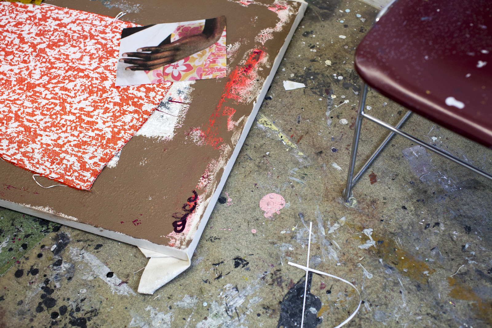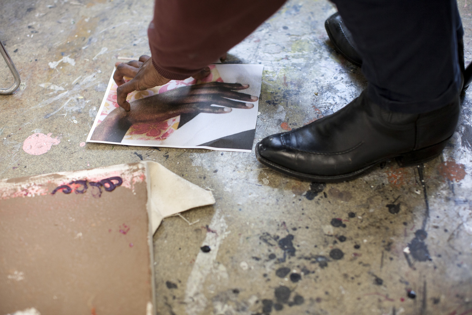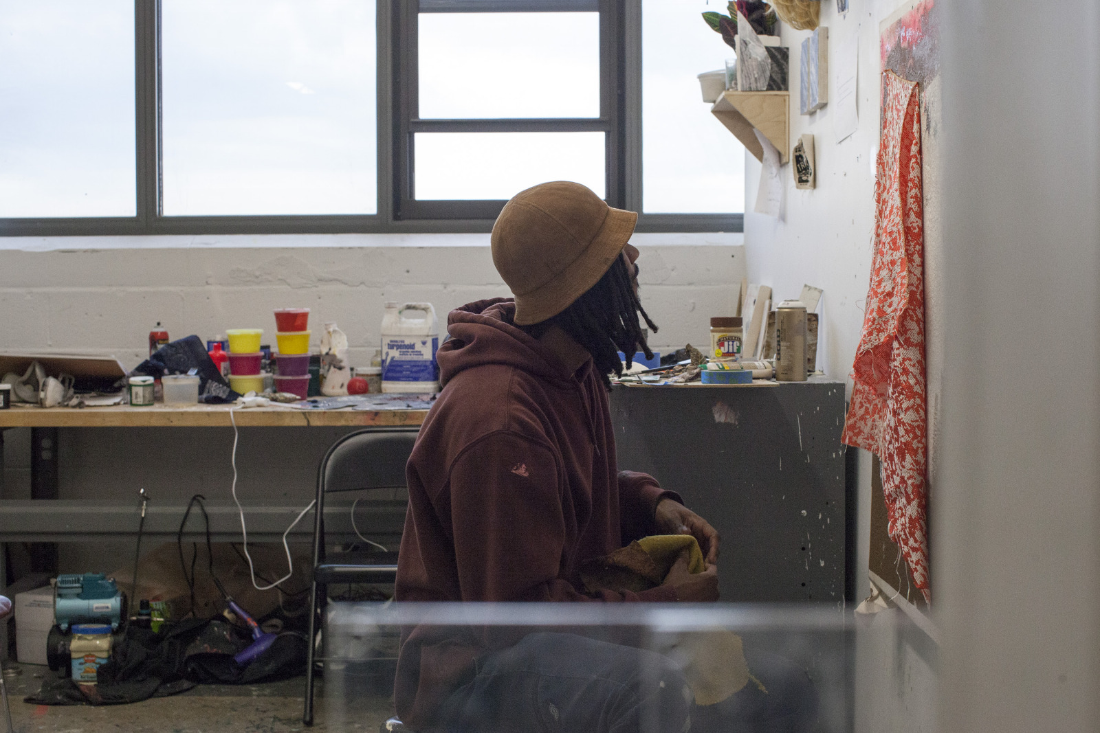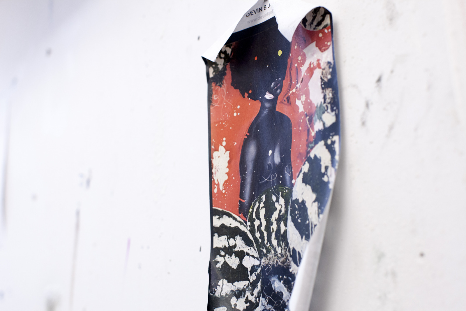 Zenat Begum on Bedford and Quincy in Bed Stuy, Brooklyn. A month later, Devin and I agreed to meet in his atelier on Flushing Avenue. Devin was shy in front of the lens, shading under his hat. An angel passed. Art has blank page vertigo. And photography cannot deal with empty. Our mutual shyness got us to stare at the wall. I started to photograph Devin's art and artefacts realising how many layers it unfolds We are always so dramatically focused on a face when ‘portraits in absence’ are often revealing much more. Now I had set him free to compose his own piece of work, jamming from print to screen to an improvised canvas on the floor. We now were busy beasts spinning without frictions around scattered and textured material to make something out of it. When I left Devin’s atelier, Brooklyn itself wore layered textures that people were filling up as if a canvas. It was a Perfect Day.