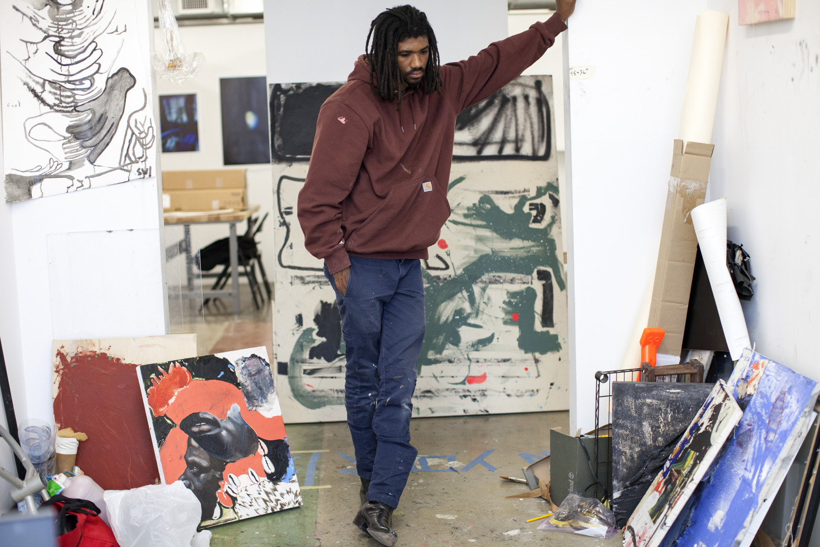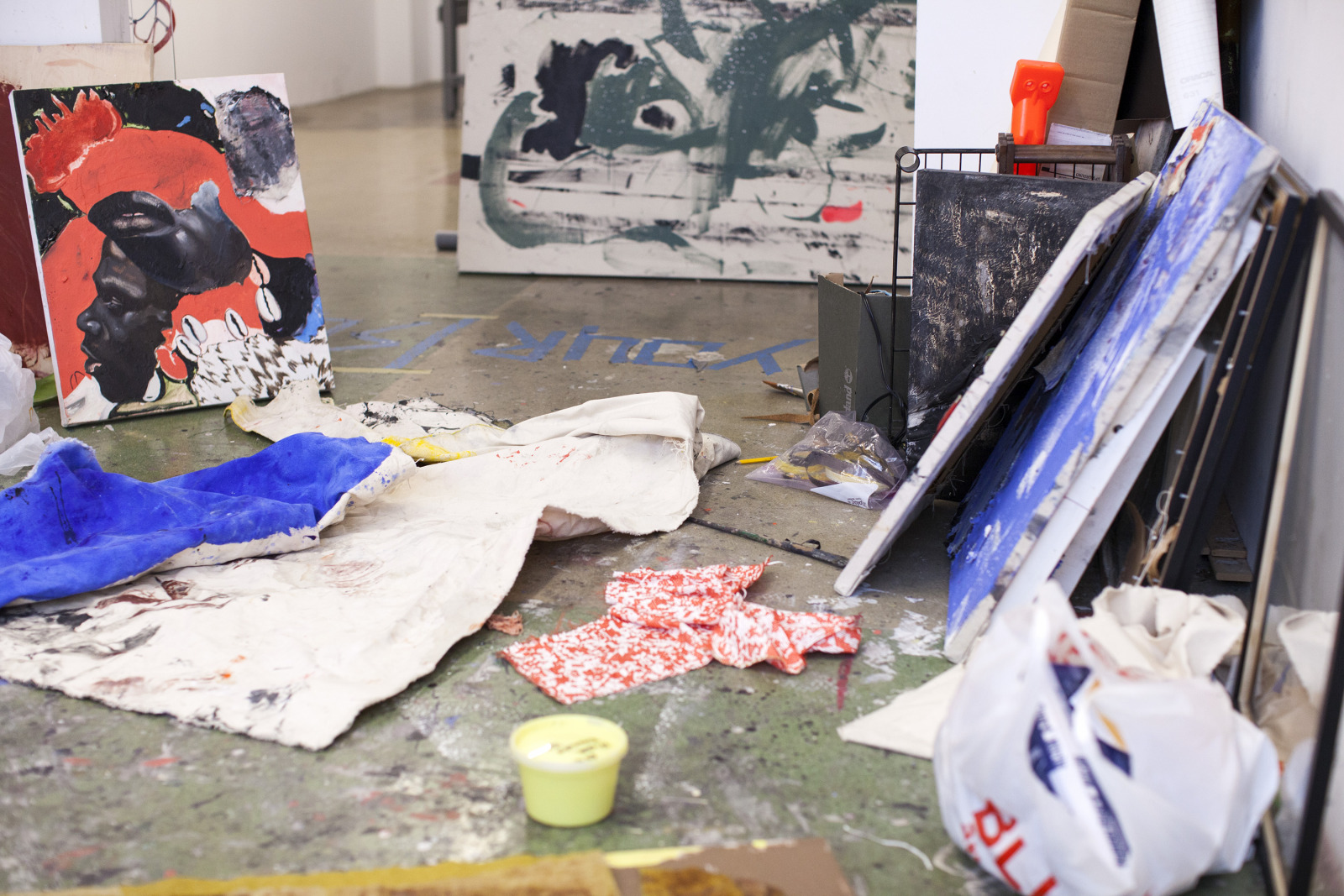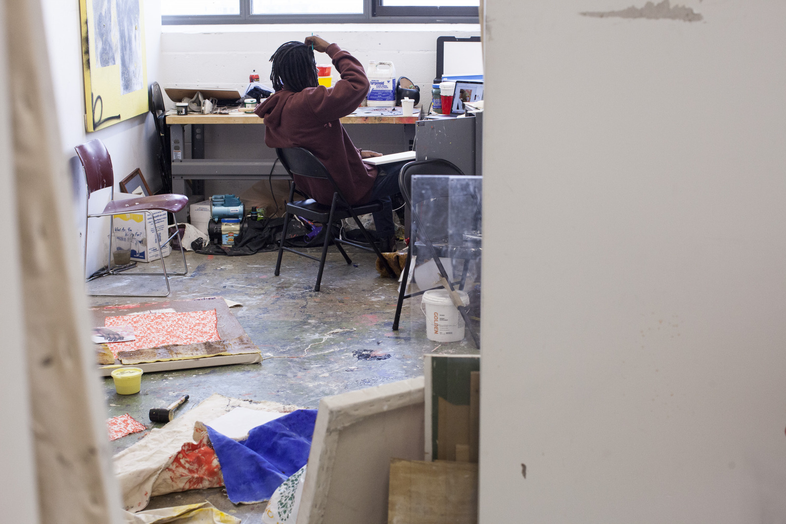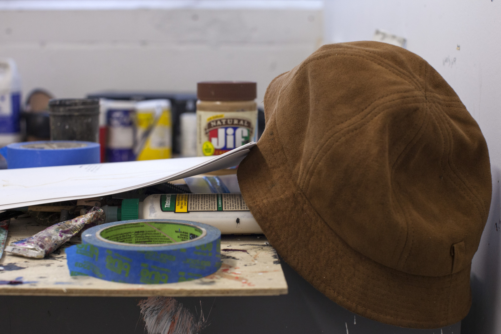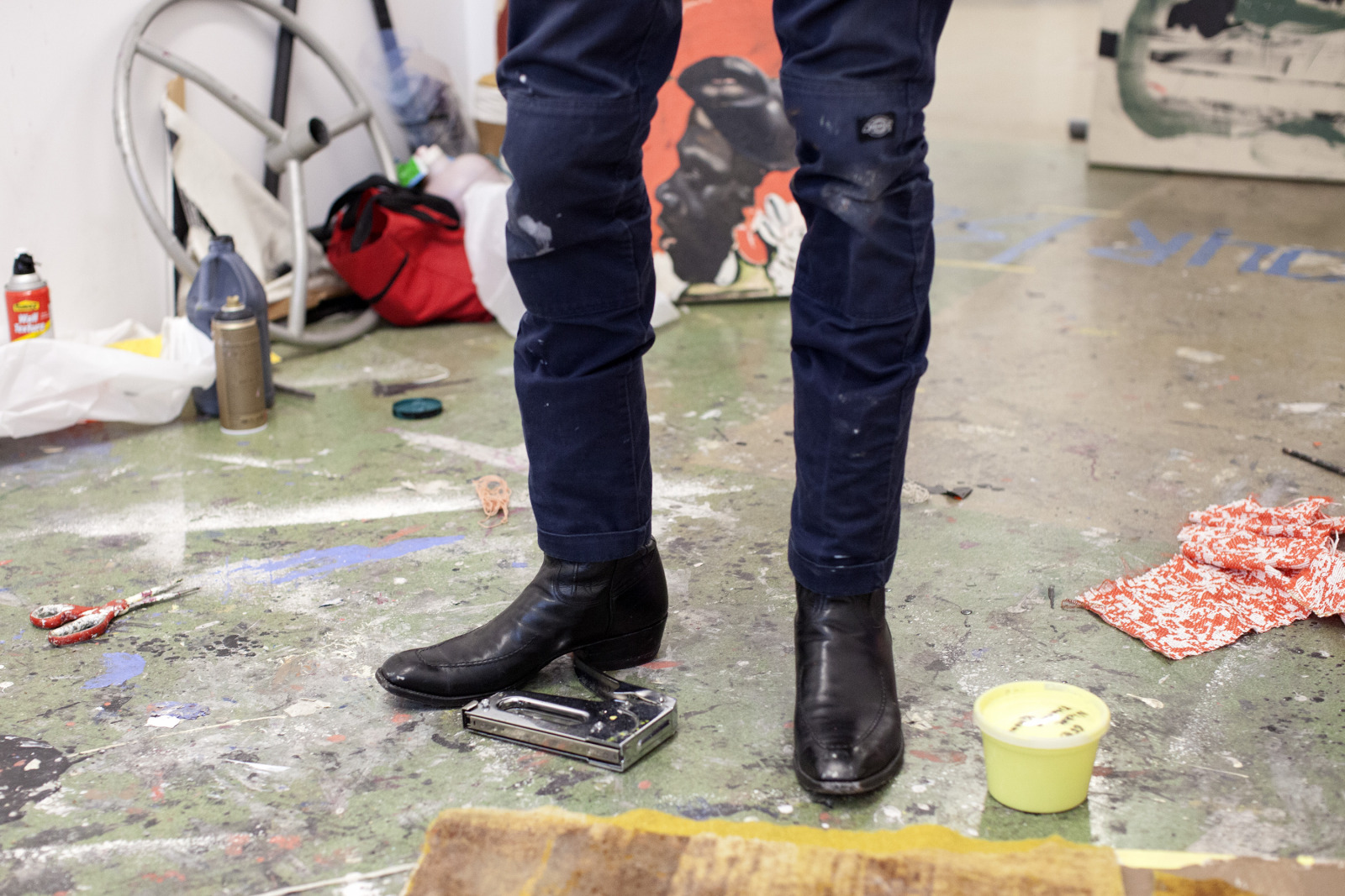 Zenat Begum on Bedford and Quincy in Bed Stuy, Brooklyn. A month later, Devin and I agreed to meet in his atelier on Flushing Avenue. Devin was shy in front of the lens, shading under his hat. An angel passed. Art has blank page vertigo. And photography cannot deal with empty. Our mutual shyness got us to stare at the wall. I started to photograph Devin's art and artefacts realising how many layers it unfolds We are always so dramatically focused on a face when ‘portraits in absence’ are often revealing much more. Now I had set him free to compose his own piece of work, jamming from print to screen to an improvised canvas on the floor. We now were busy beasts spinning without frictions around scattered and textured material to make something out of it. When I left Devin’s atelier, Brooklyn itself wore layered textures that people were filling up as if a canvas. It was a Perfect Day.