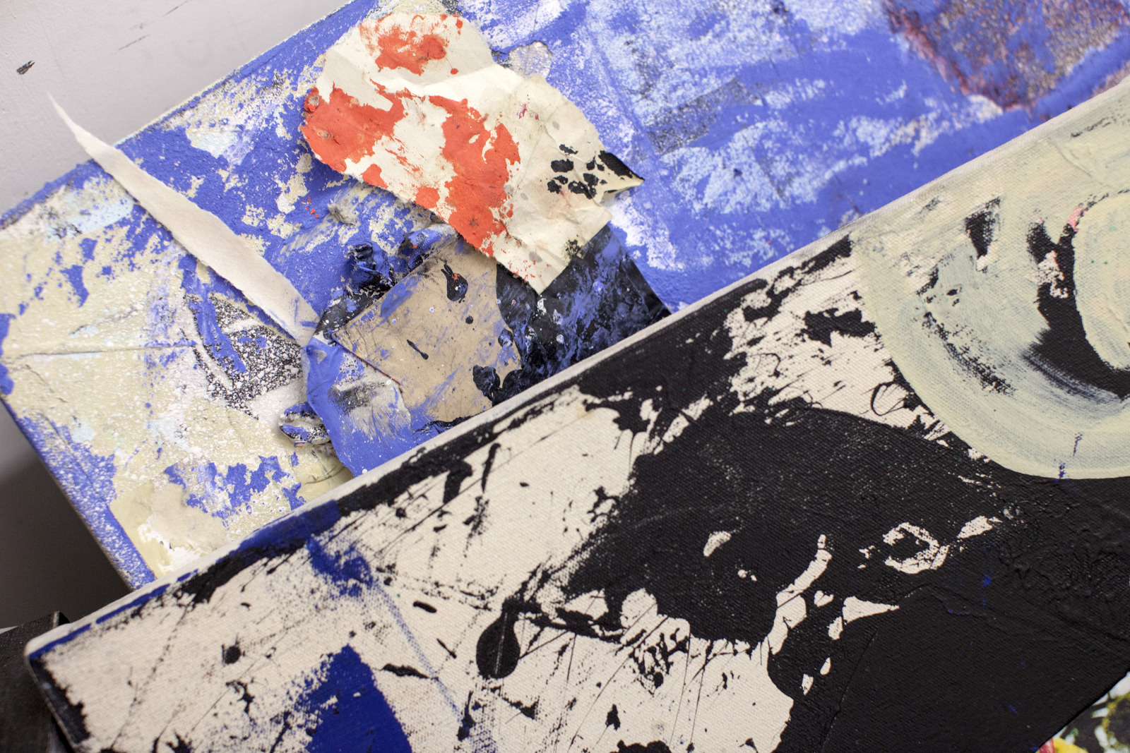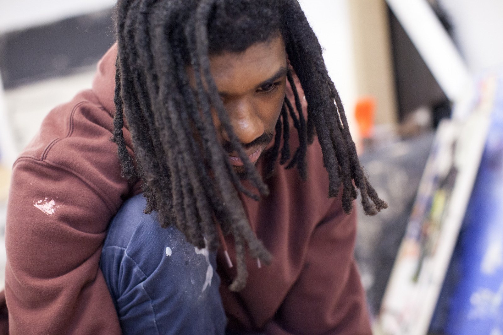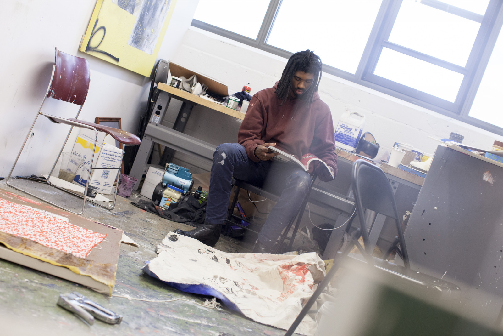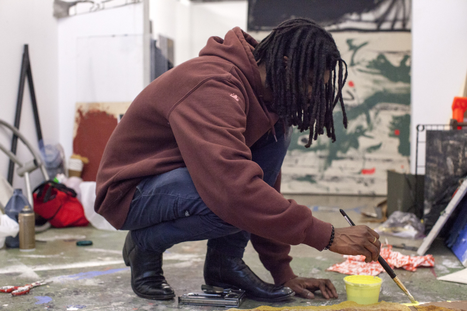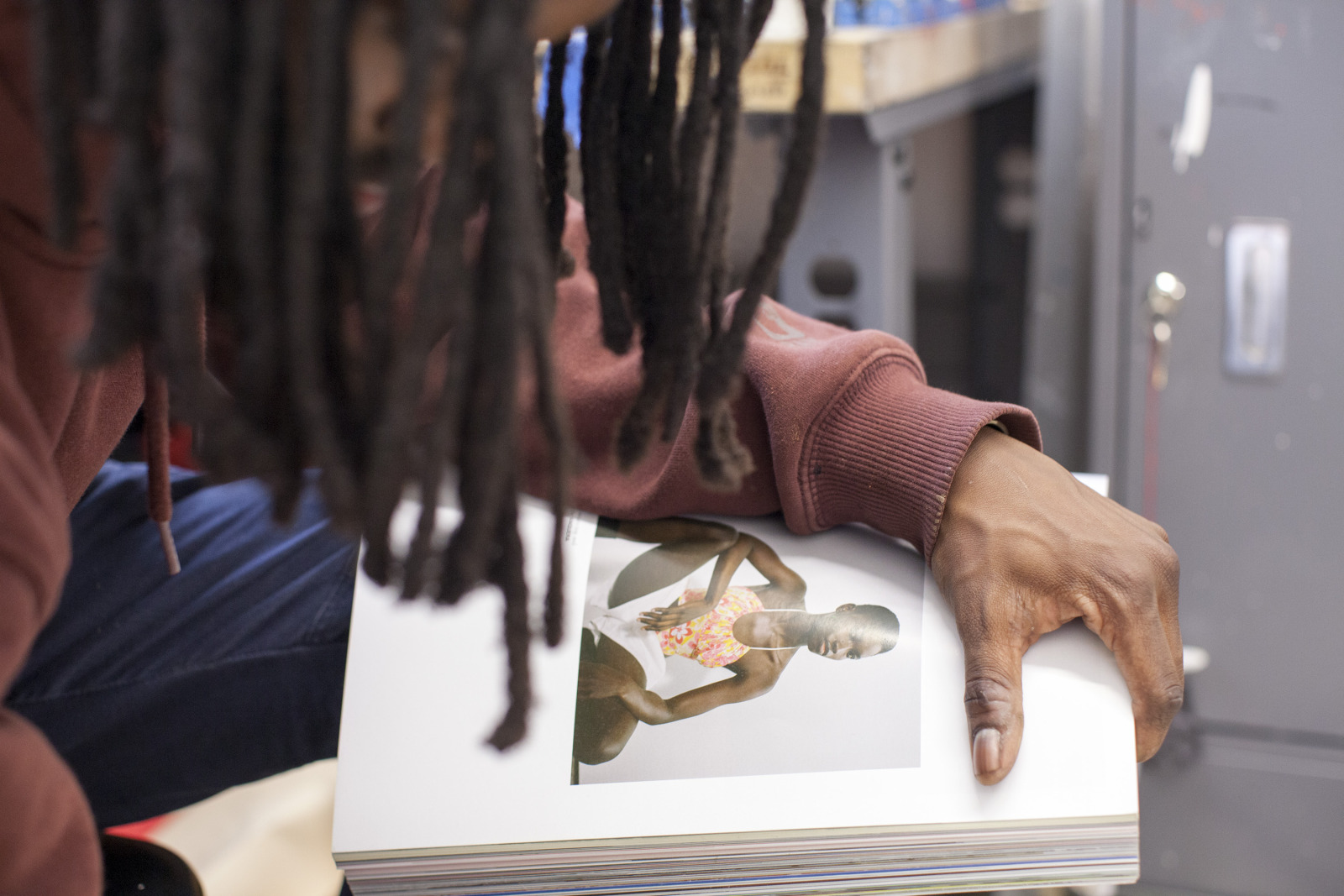Zenat Begum on Bedford and Quincy in Bed Stuy, Brooklyn. A month later, Devin and I agreed to meet in his atelier on Flushing Avenue. Devin was shy in front of the lens, shading under his hat. An angel passed. Art has blank page vertigo. And photography cannot deal with empty. Our mutual shyness got us to stare at the wall. I started to photograph Devin's art and artefacts realising how many layers it unfolds We are always so dramatically focused on a face when ‘portraits in absence’ are often revealing much more. Now I had set him free to compose his own piece of work, jamming from print to screen to an improvised canvas on the floor. We now were busy beasts spinning without frictions around scattered and textured material to make something out of it. When I left Devin’s atelier, Brooklyn itself wore layered textures that people were filling up as if a canvas. It was a Perfect Day.