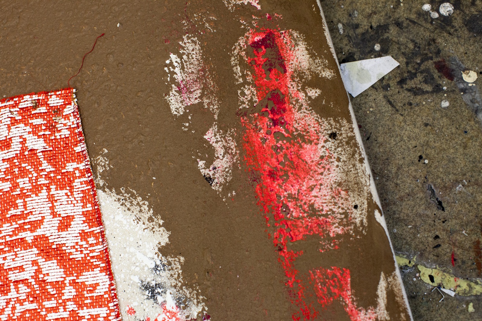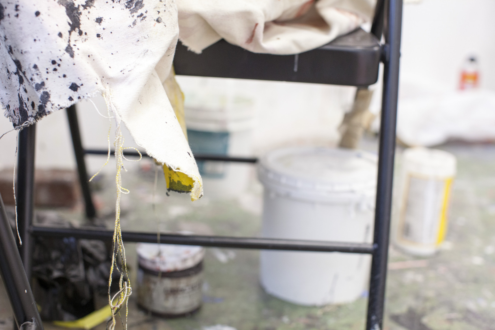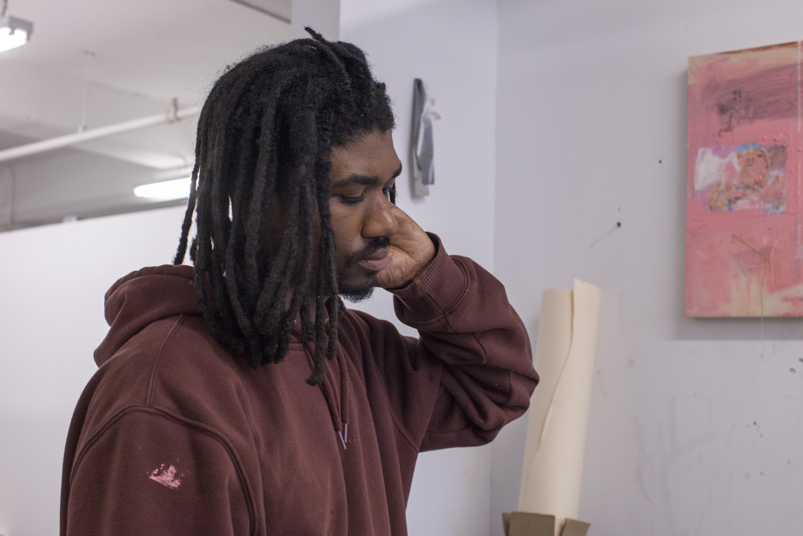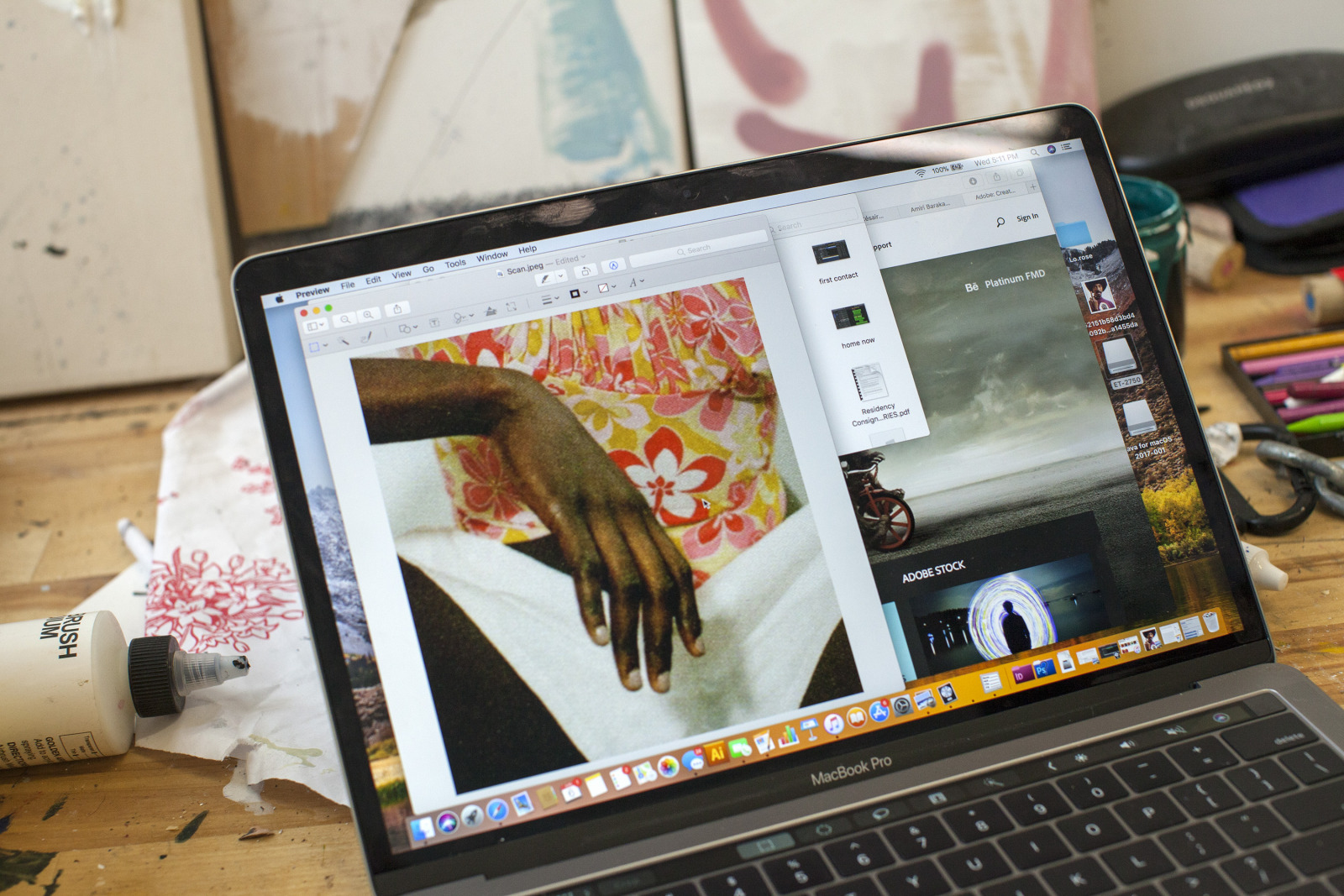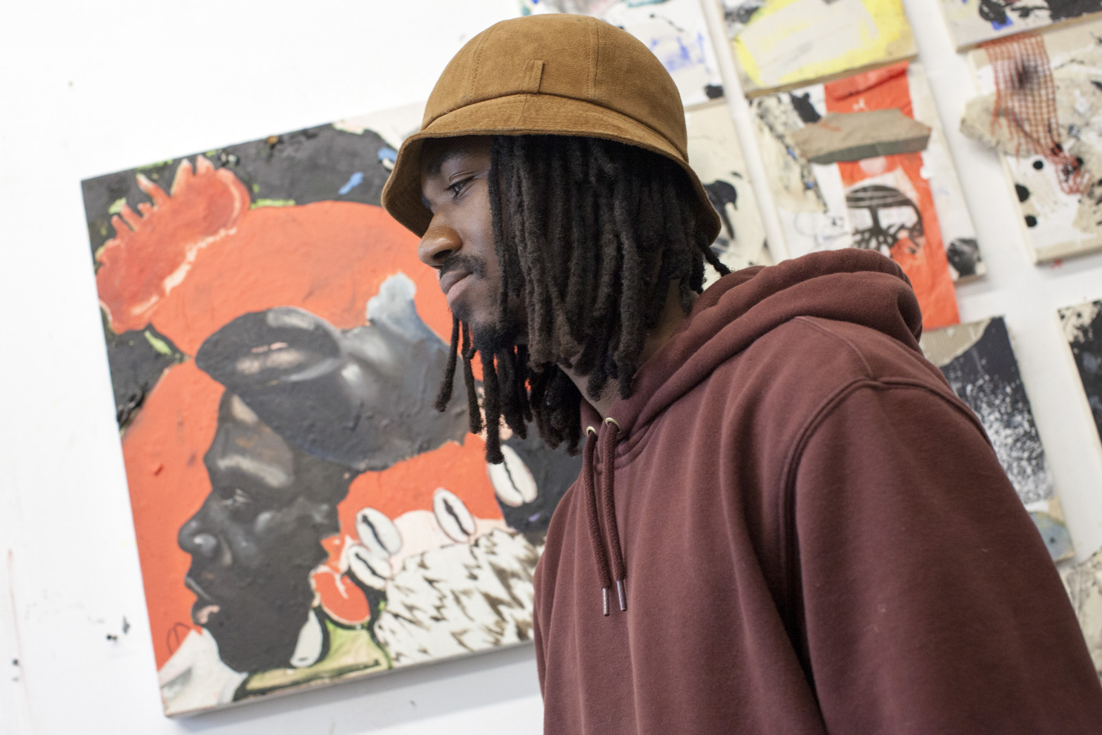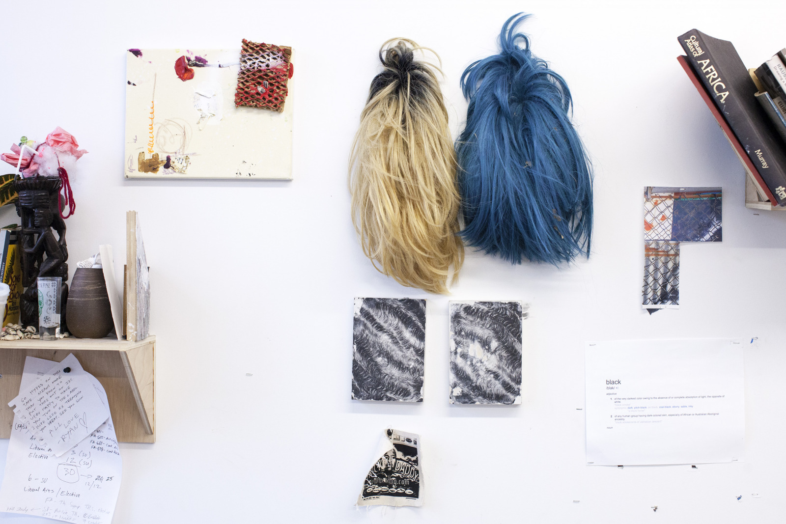 Zenat Begum on Bedford and Quincy in Bed Stuy, Brooklyn. A month later, Devin and I agreed to meet in his atelier on Flushing Avenue. Devin was shy in front of the lens, shading under his hat. An angel passed. Art has blank page vertigo. And photography cannot deal with empty. Our mutual shyness got us to stare at the wall. I started to photograph Devin's art and artefacts realising how many layers it unfolds We are always so dramatically focused on a face when ‘portraits in absence’ are often revealing much more. Now I had set him free to compose his own piece of work, jamming from print to screen to an improvised canvas on the floor. We now were busy beasts spinning without frictions around scattered and textured material to make something out of it. When I left Devin’s atelier, Brooklyn itself wore layered textures that people were filling up as if a canvas. It was a Perfect Day.