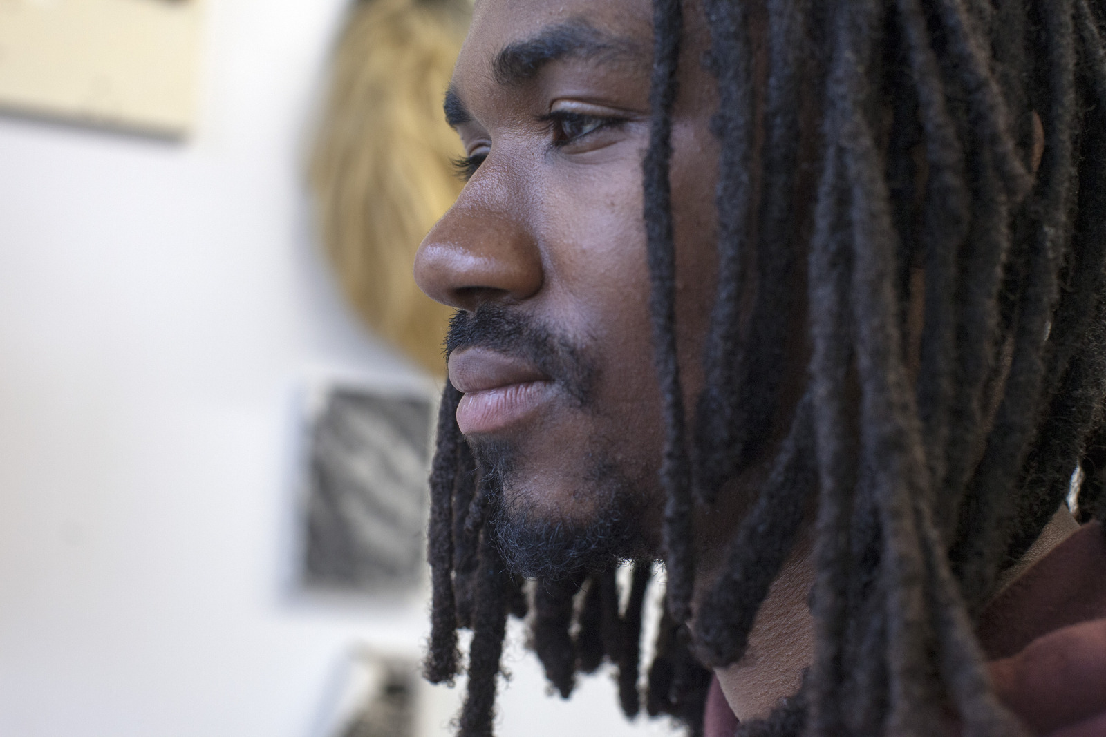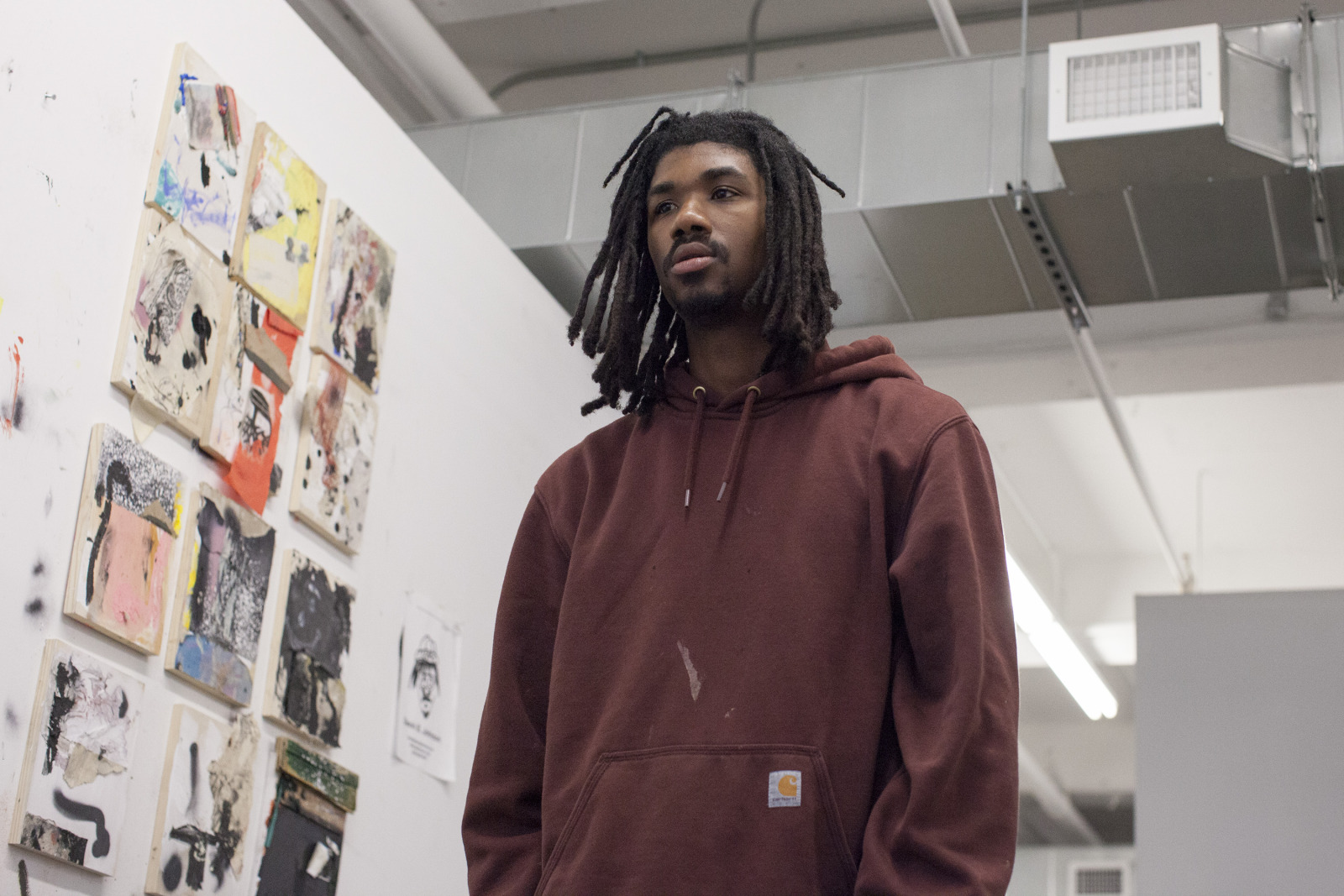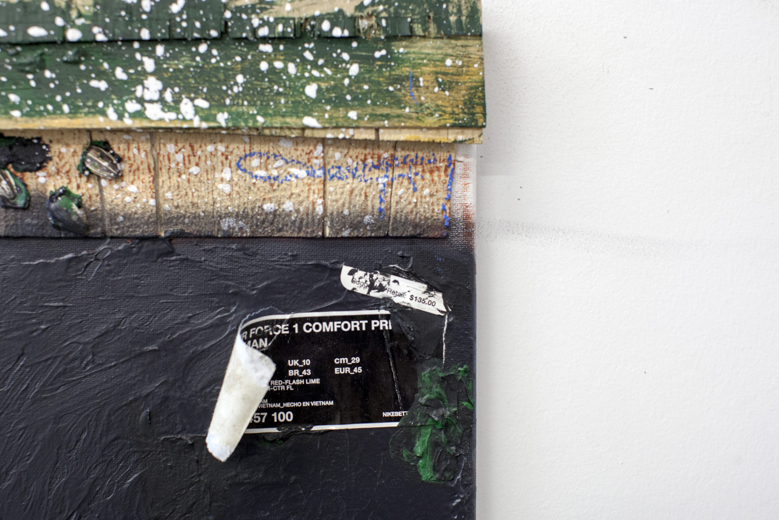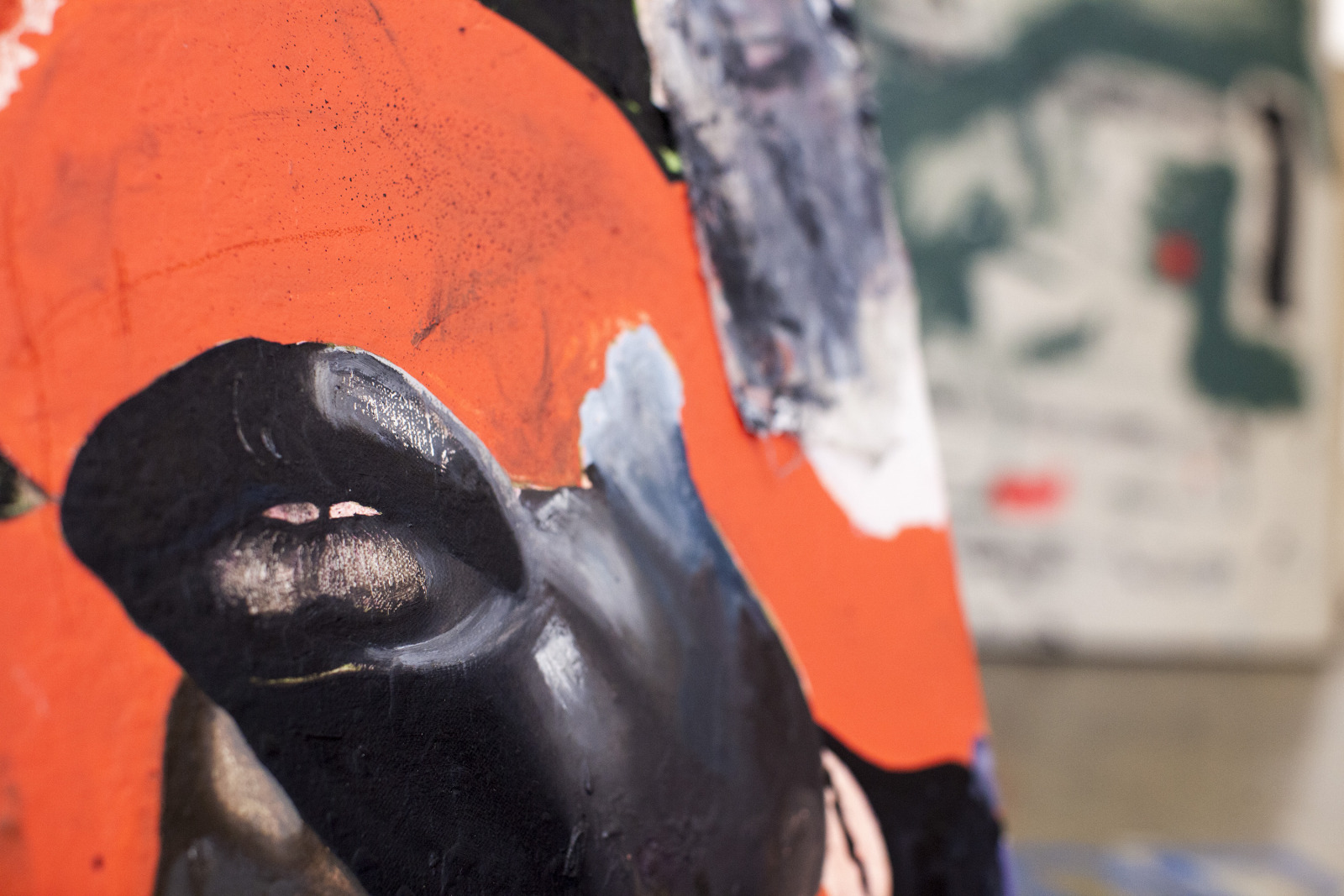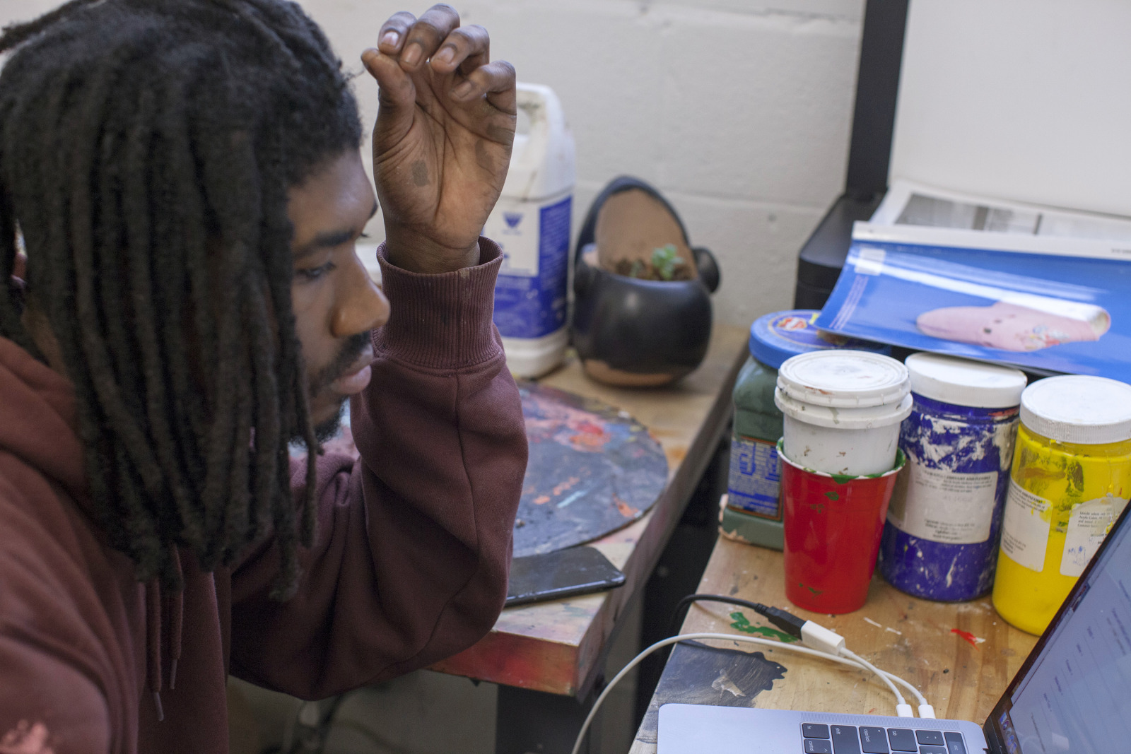 Zenat Begum on Bedford and Quincy in Bed Stuy, Brooklyn. A month later, Devin and I agreed to meet in his atelier on Flushing Avenue. Devin was shy in front of the lens, shading under his hat. An angel passed. Art has blank page vertigo. And photography cannot deal with empty. Our mutual shyness got us to stare at the wall. I started to photograph Devin's art and artefacts realising how many layers it unfolds We are always so dramatically focused on a face when ‘portraits in absence’ are often revealing much more. Now I had set him free to compose his own piece of work, jamming from print to screen to an improvised canvas on the floor. We now were busy beasts spinning without frictions around scattered and textured material to make something out of it. When I left Devin’s atelier, Brooklyn itself wore layered textures that people were filling up as if a canvas. It was a Perfect Day.