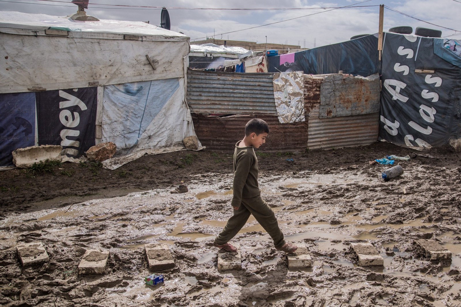 A neighbouring boy jumps over the mud left by torrential rains in the Bekaa Valley, Lebanon — Photo: Vianney Le Caer