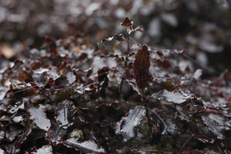 A magnolia leaf is dripping